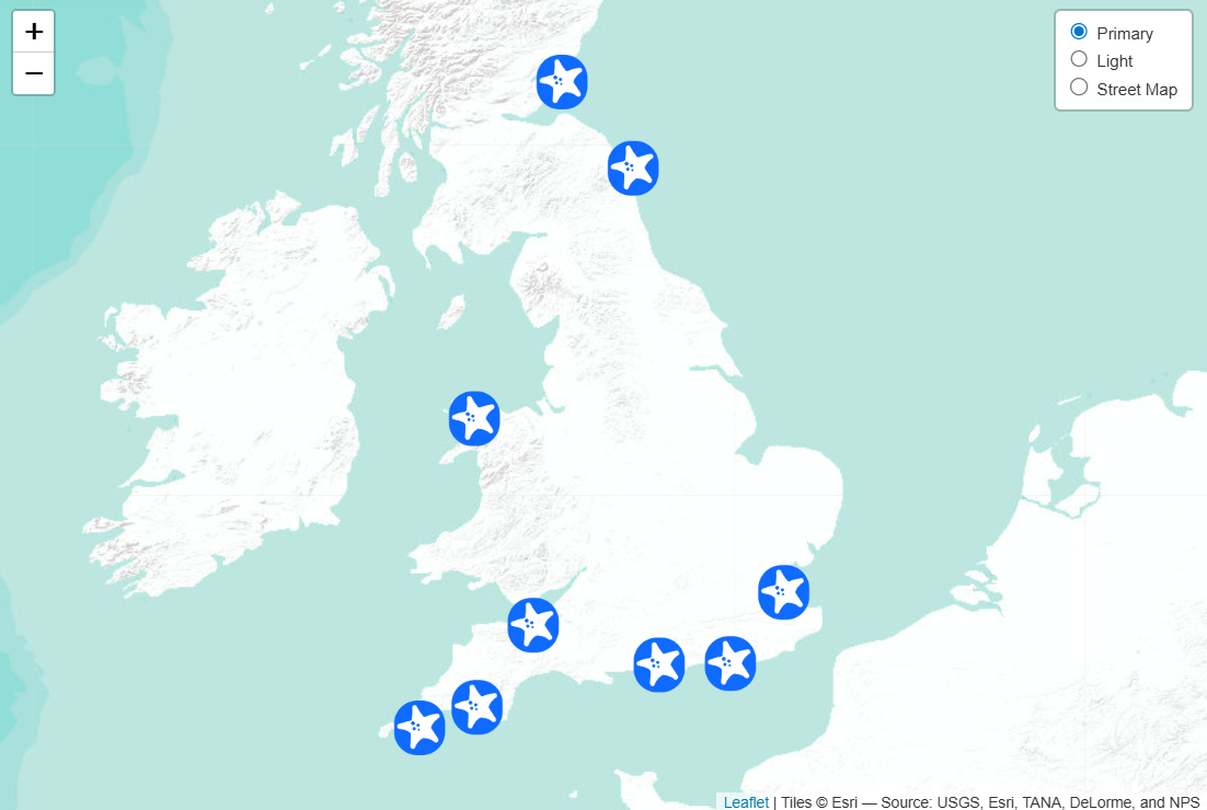 For the monthly bioblitz events, the data are collected at each of the 9 locations across the country: Castle Beach, Falmouth; Mount Batten, Plymouth; Shoeburyness, Southend-on-sea; Lee-on-the-Solent, Hampshire; Menai Bridge, Bangor; Beadnell Haven, Northumberland; Ovingdean, Brighton; East Sands, St Andrews; Kilve Beach, Somerset; and Firestone Bay, Plymouth (coming soon).